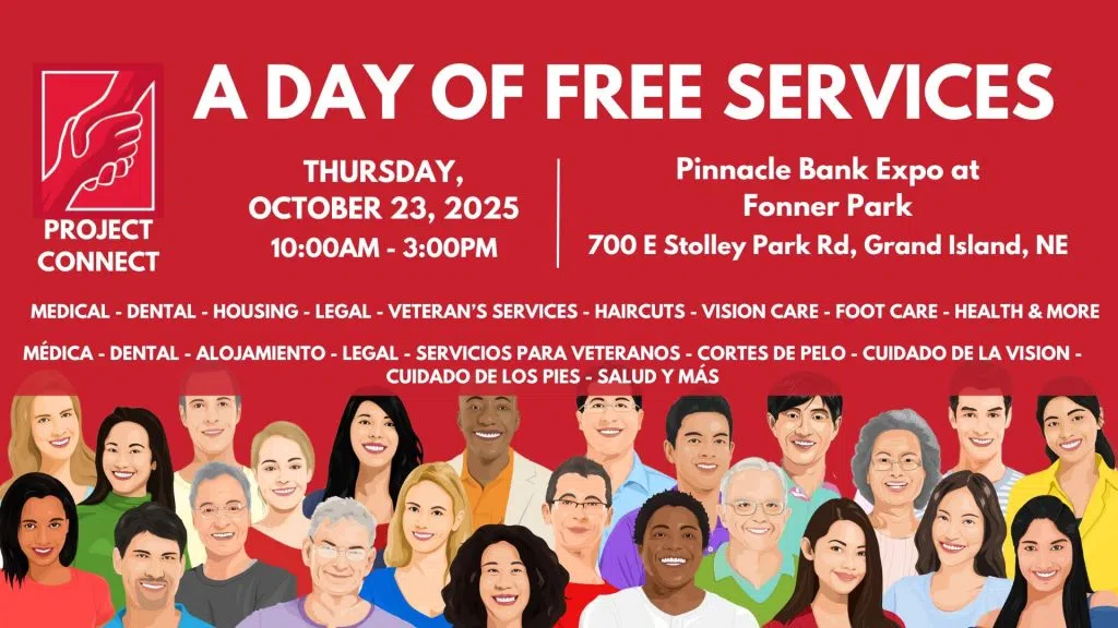 Project Connect is a one-day event offering a wide range of free services, including medical and dental care, housing support, legal assistance, veteran services, haircuts, vision and foot care, health screenings, and more. These services are available to adults experiencing homelessness, financial hardship, or those in need of essential same-day services. Free transportation will be provided from the Salvation Army, Centennial Towers, and the Grand Island VA Medical Center.